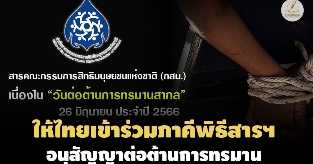 กสม.ส่งสาร 'วันต่อต้านการทรมานสากล' การกระทำทรมานเพื่อลงโทษ ทำร้าย หรือบีบบังคับให้รับสารภาพ คือการละเมิดสิทธิมนุษยชนอย่างร้ายแรง ขัดต่อหลักกฎหมายและศีลธรรมอันดี พร้อมขอให้ไทยพิจารณาเข้าร่วมเป็นภาคีในพิธีสารเลือกรับของอนุสัญญาต่อต้านการทรมานฯ