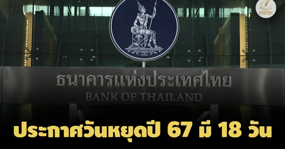 ธปท.ประกาศวันหยุดธนาคารปี 67 รวม 18 วัน ตั้งแต่เดือน ม.ค.-ธ.ค.
