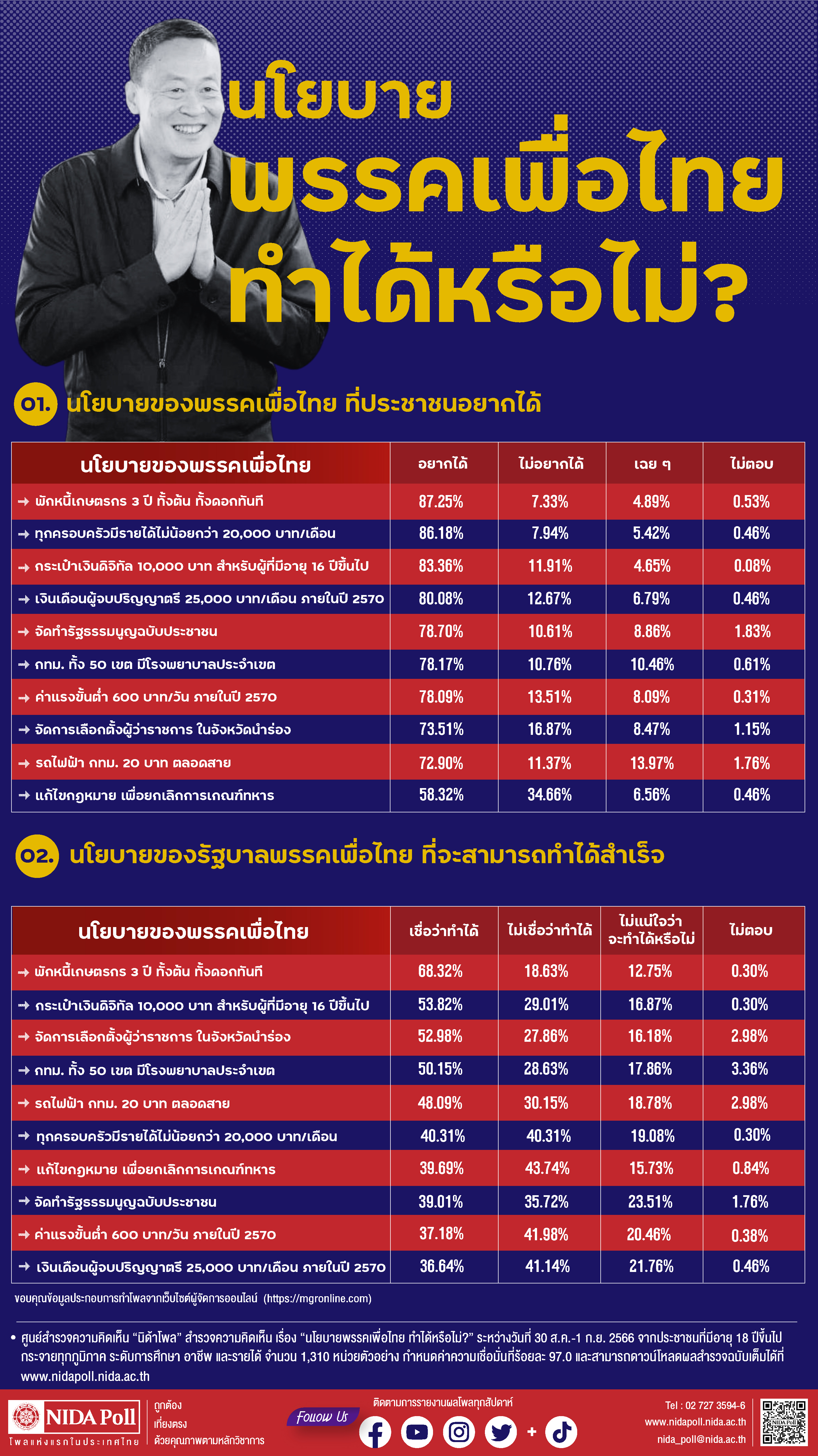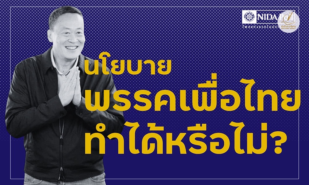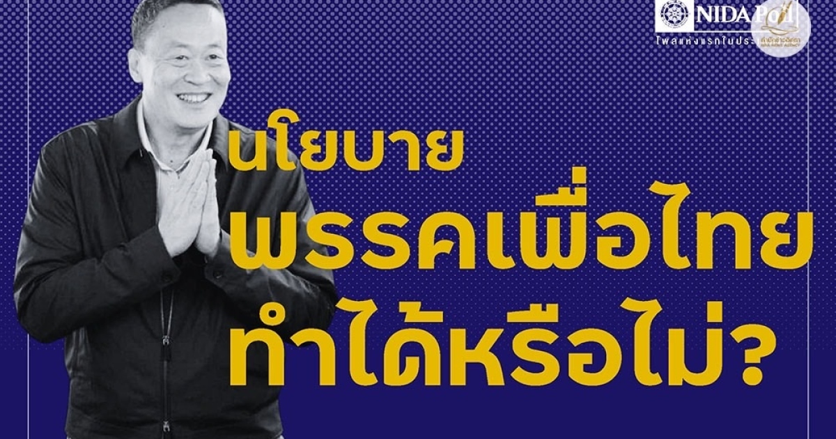 สำนักข่าวอิศรา (www.isranews.org) รายงานว่า เมื่อวันที่ 3 ก.ย. 2566 ศูนย์สำรวจความคิดเห็น นิด้าโพล' สถาบันบัณฑิตพัฒนบริหารศาสตร์ (นิด้า) เปิดเผยผลสำรวจของประชาชน เรื่อง 'นโยบายพรรคเพื่อไทยทำได้หรือไม่?' ทำการสำรวจระหว่างวันที่ 30 สิงหาคม ถึง วันที่ 1 กันยายน 2566 จากประชาชนที่มีอายุ 18 ปีขึ้นไป กระจายทุกภูมิภาค ระดับการศึกษา อาชีพ และรายได้ ทั่วประเทศ รวมทั้งสิ้น จำนวน 1,310 หน่วยตัวอย่าง เกี่ยวกับนโยบายของพรรคเพื่อไทย การสำรวจอาศัยการสุ่มตัวอย่างโดยใช้ความน่าจะเป็นจากบัญชีรายชื่อฐานข้อมูลตัวอย่างหลัก (Master Sample) ของ 'นิด้าโพล' สุ่มตัวอย่างด้วยวิธีแบบง่าย (Simple Random Sampling) เก็บข้อมูลด้วยวิธีการสัมภาษณ์ทางโทรศัพท์ โดยกำหนดค่าความเชื่อมั่น ร้อยละ 97.0