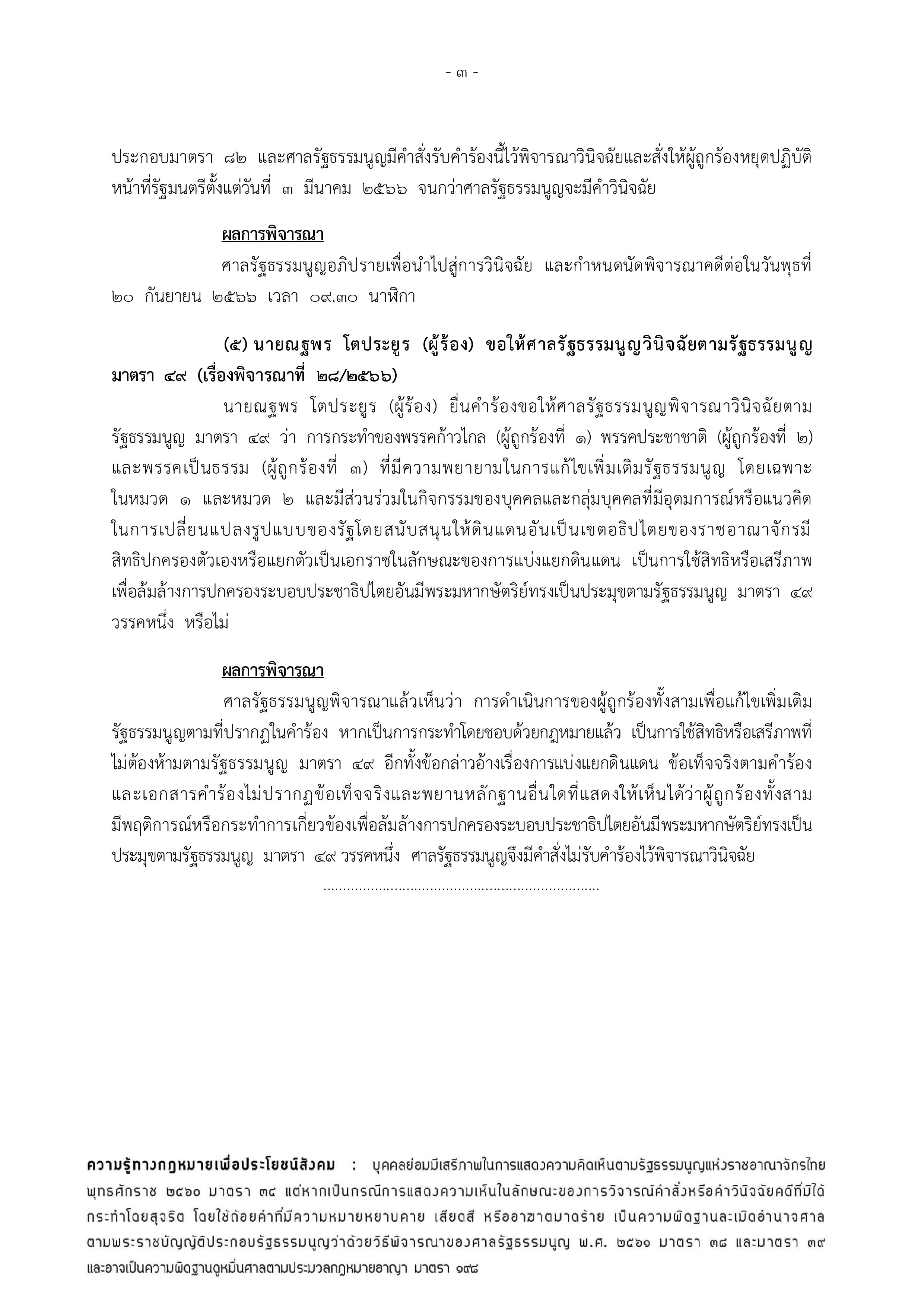 สำนักข่าวอิศรา (www.isranews.org) รายงานว่า เมื่อวันที่ 13 กันยายน 2566 ศาลรัฐธรรมนูญ เผยผลการพิจารณา กรณี นายณฐพร โตประยูร (ผู้ร้อง) ยื่นคำร้องขอให้ศาลรัฐธรรมนูญพิจารณาวินิจฉัยตามรัฐธรรมนูญ มาตรา 49 ว่า การกระทำของพรรคก้าวไกล (ผู้ถูกร้องที่ 1) พรรคประชาชาติ (ผู้ถูกร้องที่ 2) และพรรคเป็นธรรม (ผู้ถูกร้องที่ 3) ที่มีความพยายามในการแก้ไขเพิ่มเติมรัฐธรรมนูญ โดยเฉพาะในหมวด 1 และหมวด 2 และมีส่วนร่วมในกิจกรรมของบุคคลและกลุ่มบุคคลที่มีอุดมการณ์หรือแนวคิดในการเปลี่ยนแปลงรูปแบบของรัฐ โดยสนับสนุนให้ดินแดนอันเป็นเขตอธิปไตยของราชอาณาจักรมีสิทธิปกครองตัวเองหรือแยกตัวเป็นเอกราชในลักษณะของการแบ่งแยกดินแดน เป็นการใช้สิทธิหรือเสรีภาพเพื่อล้มล้างการปกครองระบอบประชาธิปไตยอันมีพระมหากษัตริย์ทรงเป็นประมุข ตามรัฐธรรมนูญ มาตรา 49 วรรคหนึ่ง หรือไม่