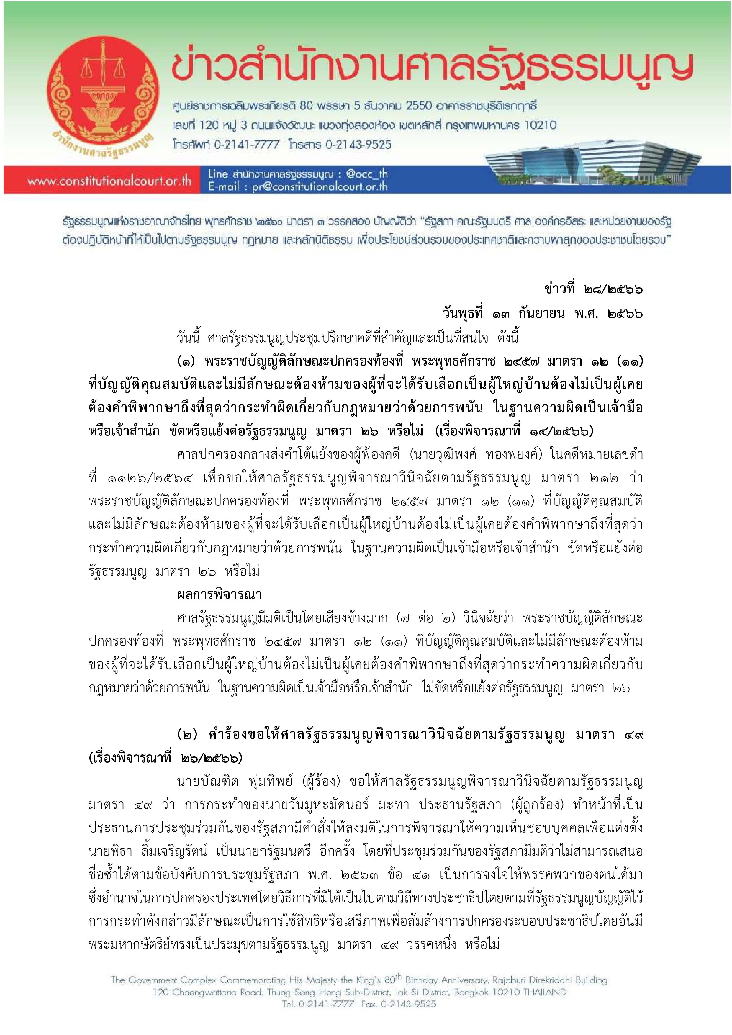 สำนักข่าวอิศรา (www.isranews.org) วันที่ 13 ก.ย. 2566 ศาลรัฐธรรมนูญ ได้ประชุมปรึกษาคดีที่สำคัญและเป็นที่สนใจ ในกรณี นายบัณฑิต พุมทิพย์ (ผู้ร้อง) ขอให้ศาลรัฐธรรมนูญพิจารณาวินิจฉัยตามรัฐธรรมนูญมาตรา 49 ว่า การกระทำของนายวันมูหะมัดนอร์ มะทา ประธานรัฐสภา (ผู้ถูกร้อง) ทำหน้าที่เป็นประธานการประชุมร่วมกันของรัฐสภามีคำสั่งให้ลงมติในการพิจารณาให้ความเห็นชอบบุคคลเพื่อแต่งตั้งนายพิธา ลิ้มเจริญรัตน์ เป็นนายกรัฐมนตรี อีกครั้ง โดยที่ประชุมร่วมกันของรัฐสภามีมติว่าไม่สามารถเสนอชื่อซ้ำได้ตามข้อบังคับการประชุมรัฐสภา พ.ศ. 2563 ข้อ 41 เป็นการจงใจให้พรรคพวกของตนได้มาซึ่งอำนาจในการปกครองประเทศ โดยวิธีการที่มิได้เป็นไปตามวิถีทางประชาธิปไตยตามที่รัฐธรรมนูญบัญญัติไว้ การกระทำดังกล่าวมีลักษณะเป็นการใช้สิทธิหรือเสรีภาพเพื่อล้มล้างการปกครองระบอบประชาธิปไตยอันมีพระมหากษัตริย์ทรงเป็นประมุขตามรัฐธรรมนูญ มาตรา 49 วรรคหนึ่ง หรือไม่