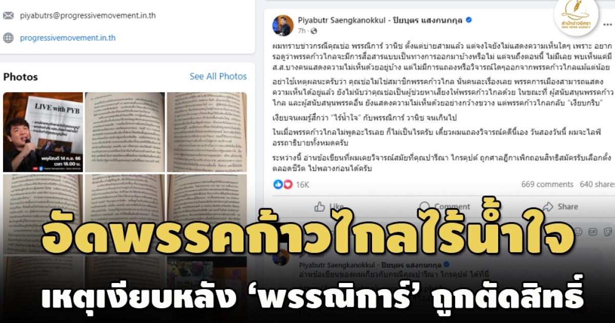สำนักข่าวอิศรา (www.isranews.org) รายงานว่าเกี่ยวกับกรณี นางสาวพรรณิการ์ วานิช อดีต สส.พรรคอนาคตใหม่ และโฆษกคณะก้าวหน้าถูกศาลฎีกาสั่งตัดสิทธิ์ทางการเมืองตลอดไป โดยวันที่ 21 ก.ย. นายปิยบุตร แสงกนกกุล เลขาธิการคณะก้าวหน้า โพสต์เฟซบุ๊กกรณีนี้ ว่า