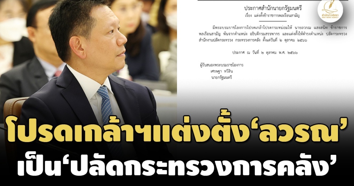 ราชกิจจานุเบกษา แพร่ประกาศสำนักนายกฯ โปรดเกล้าฯแต่งตั้ง 'ลวรณ แสงสนิท' ดำรงตำแหน่ง ‘ปลัดกระทรวงการคลัง’ คนใหม่