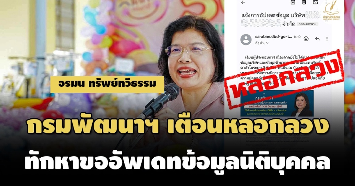 ‘กรมพัฒนาธุรกิจการค้า’ เตืออนเคสมิจฉาชีพหลอกติดต่อให้อัพเดทข้อมูลนิติบุคคลไม่เป็นความจริง ย้ำชัดกรมไม่เคยติดต่อหาใครก่อน เว้นมีประชาชนสอบถามข้อมูลมาก่อน