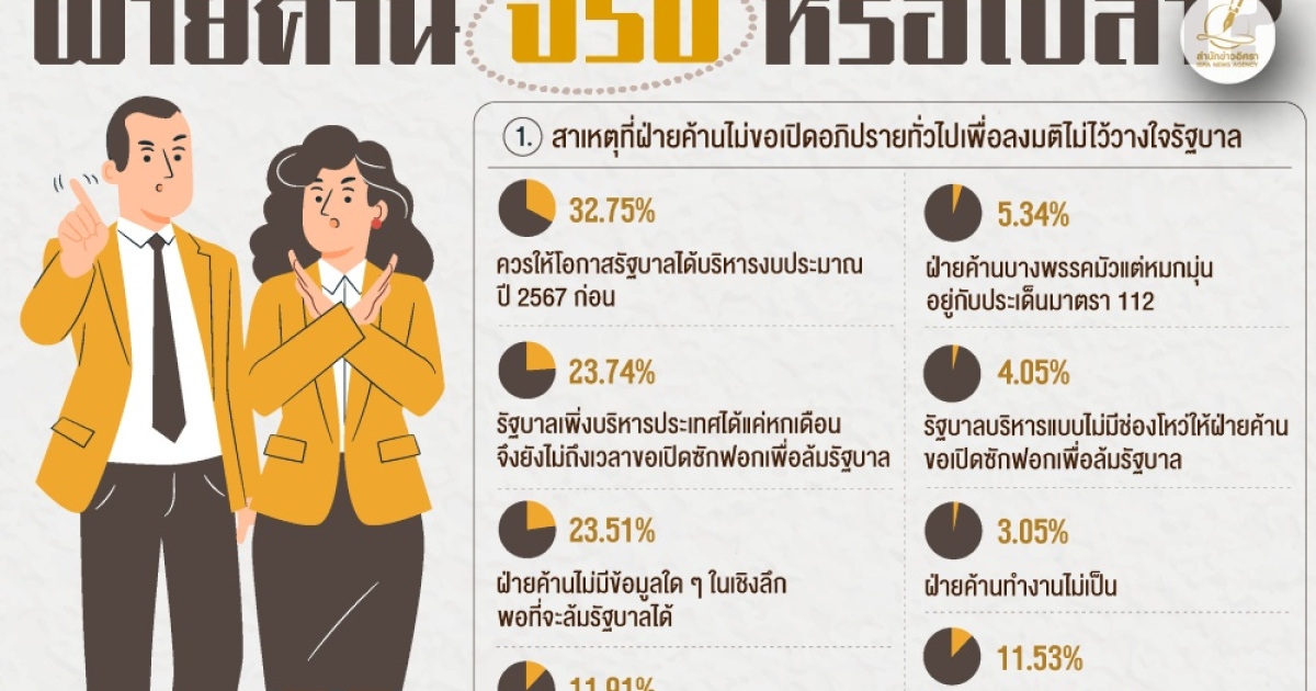 จากการสำรวจเมื่อถามถึงความคิดเห็นของประชาชนเกี่ยวกับสาเหตุที่ฝ่ายค้านไม่ขอเปิดอภิปรายทั่วไปเพื่อลงมติไม่ไว้วางใจรัฐบาลพบว่า ตัวอย่าง