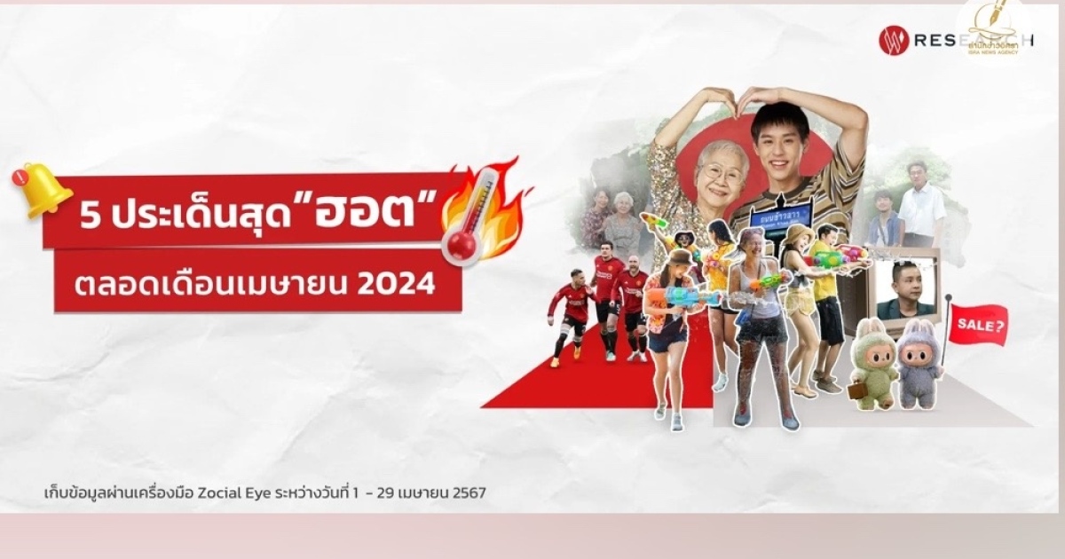 สำนักข่าวอิศรา (www.isranews.org) รายงานว่า เมื่อวันที่ 3 พ.ค. 2567 Wisesight Research เปิดเผยข้อมูล '5 ประเด็นสุดฮอต ตลอดเดือนเมษายน 2024' โดยทำการเก็บข้อมูลตั้งแต่วันที่ 1 - 29 เมษายน 2567 พบว่ามีการพูดถึงเหล่าประเด็นร้อนโดยรวมกว่า 959,686 messages ได้รับเอ็นเกจเมนต์รวมกว่า 473 ล้านครั้ง