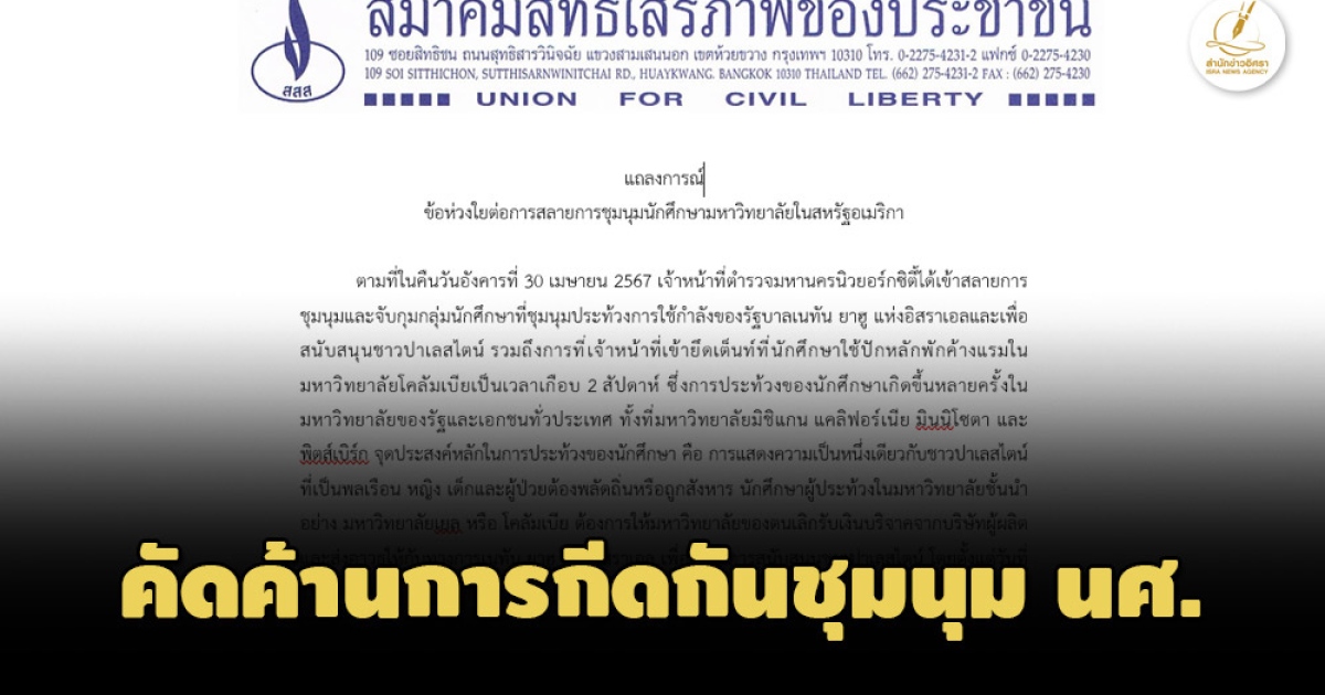 สำนักข่าวอิศรา (www.isranews.org) รายงานว่า เมื่อวันที่ 4 พ.ค. 2567 สมาคมสิทธิเสรีภาพของประชาชน (สสส.) ออกแถลงการณ์ข้อห่วงใยต่อการสลายการชุมนุมนักศึกษามหาวิทยาลัยในสหรัฐอเมริกา ระบุว่า