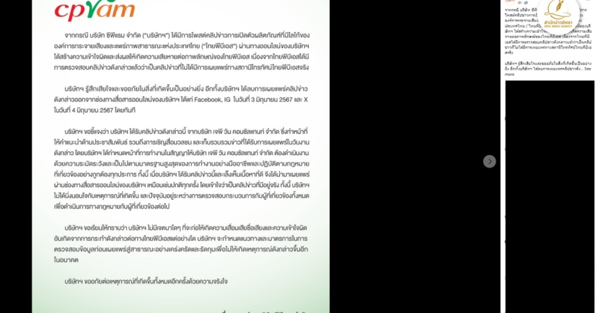 สำนักข่าวอิศรา (www.isranews.org) รายงานว่าเมื่อวันที่ 6 มิ.ย. เฟซบุ๊กบริษัท ซีพีแรม จำกัด ได้โพสต์แถลงการณ์ขอโทษของบริษัทระบุว่า จากกรณี บริษัท ซีพีแรม จำกัด (“บริษัทฯ”) ได้มีการโพสต์คลิปข่าวการเปิดตัวผลิตภัณฑ์ที่มีโลโก้ขององค์การกระจายเสียงและแพร่ภาพสาธารณะแห่งประเทศไทย (“ไทยพีบีเอส”) ผ่านทางออนไลน์ของบริษัทฯ ได้สร้างความเข้าใจผิดและส่งผลให้เกิดความเสียหายต่อภาพลักษณ์ของไทยพีบีเอส เนื่องจากไทยพีบีเอสได้มีการตรวจสอบคลิปข่าวดังกล่าวแล้วว่าเป็นคลิปข่าวที่ไม่ได้มีการเผยแพร่ทางสถานีโทรทัศน์ไทยพีบีเอสจริง