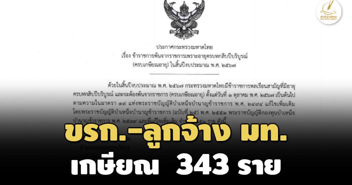 สำนักข่าวอิศรา (www.isranews.org) รายงานว่า กระทรวงมหาดไทย ออกประกาศเรื่อง ให้ข้าราชการ และลูกจ้างประจำ ในสังกัด มท. และ สป.มท. จำนวน 343 ราย พ้นจากราชการเพราะอายุครบหกสิบปีบริบูรณ์ (ครบเกษียณอายุ) ในสิ้นปีงบประมาณ พ.ศ. 2567 ลงนามโดย นายสุทธิพงษ์ จุลเจริญ ปลัดกระทรวงมหาดไทย (ป.มท.)