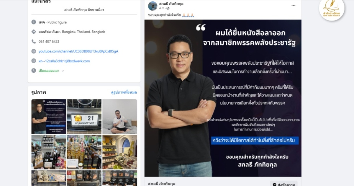 ดังนั้น ผมจึงได้ยื่นหนังสือลาออกจากสมาชิกพรรคพลังประชารัฐ และตำแหน่งต่าง ๆ ในพรรคตั้งแต่บัดนี้เป็นต้นไป เพื่อที่จะได้ออกมาทบทวนและศึกษาเพิ่มเติมถึงแนวทางใหม่ ๆ ในการทำงานการเมืองต่อไป…หวังว่าจะได้มีโอกาสได้ทำในสิ่งที่รักต่อไปครับ” นายสกลธี" ระบุ