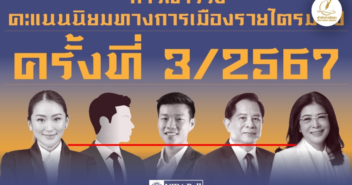สำนักข่าวอิศรา (www.isranews.org) รายงานว่า เมื่อวันที่ 29 ก.ย. 2567 ศูนย์สำรวจความคิดเห็น 'นิด้าโพล' สถาบันบัณฑิตพัฒนบริหารศาสตร์ (นิด้า) เปิดเผยผลการสำรวจของประชาชน เรื่อง “การสำรวจคะแนนนิยมทางการเมืองรายไตรมาส ครั้งที่ 3/2567” ทำการสำรวจระหว่างวันที่ 16-23 กันยายน 2567 จากประชาชนที่มีอายุ 18 ปีขึ้นไป กระจายทุกภูมิภาค ระดับการศึกษา อาชีพ และรายได้ ทั่วประเทศ รวมทั้งสิ้น จำนวน 2,000 หน่วยตัวอย่าง เกี่ยวกับคะแนนนิยมทางการเมือง การสำรวจอาศัยการสุ่มตัวอย่างโดยใช้ความน่าจะเป็นจากบัญชีรายชื่อฐานข้อมูลตัวอย่างหลัก (Master Sample) ของ “นิด้าโพล” สุ่มตัวอย่างแบบหลายขั้นตอน (Multi-stage Sampling) เก็บข้อมูลด้วยวิธีการสัมภาษณ์ทางโทรศัพท์ โดยกำหนดค่าความเชื่อมั่น ร้อยละ 97.0