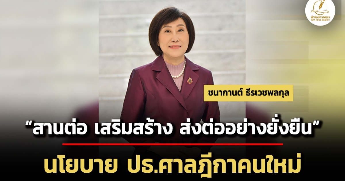 ‘ชนากานต์ ธีรเวชพลกุล’ ประธานศาลฎีกาคนใหม่ ประกาศแนวนโยบาย “สานต่อ เสริมสร้าง ส่งต่ออย่างยั่งยืน” ขอทุกภาคส่วน ในระยะ 1 ปีต่อจากนี้ ตั้งใจปฏิบัติราชการด้วยความสง่างาม ตระหนักในหน้าที่ รับผิดชอบต่อสังคม ตามวิถีทางแห่งตุลาการ