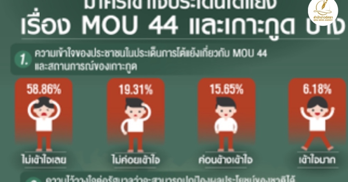 สำนักข่าวอิศรา (www.isranews.org) รายงานว่า เมื่อวันที่ 17 พ.ย. 2567 ศูนย์สำรวจความคิดเห็น 'นิด้าโพล' สถาบันบัณฑิตพัฒนบริหารศาสตร์ (นิด้า) สำรวจความคิดเห็น เรื่อง “มีใครเข้าใจประเด็นโต้แย้งเรื่อง MOU 44 และเกาะกูด บ้าง” ทำการสำรวจระหว่างวันที่ 12-13 พฤศจิกายน 2567 จากประชาชนที่มีอายุ 18 ปีขึ้นไป กระจายทุกภูมิภาค ระดับการศึกษา อาชีพ และรายได้ ทั่วประเทศ รวมจำนวนทั้งสิ้น 1,310 หน่วยตัวอย่าง เกี่ยวกับความเข้าใจของประชาชนในประเด็นการโต้แย้ง MOU 44 และสถานการณ์ของเกาะกูด การสำรวจอาศัยการสุ่มตัวอย่างโดยใช้ความน่าจะเป็นจากบัญชีรายชื่อฐานข้อมูลตัวอย่างหลัก (Master Sample) ของ “นิด้าโพล” สุ่มตัวอย่างแบบหลายขั้นตอน (Multi-stage Sampling) เก็บข้อมูลด้วยวิธีการสัมภาษณ์ทางโทรศัพท์ โดยกำหนดค่าความเชื่อมั่น ร้อยละ 97.0