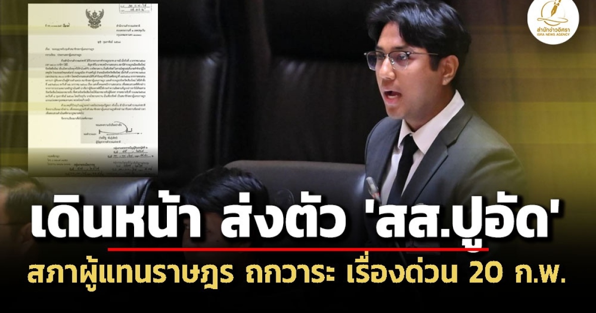 ว่าที่ร้อยตำรวจตรี อาพัทธ์ สุขะนันท์ เลขาธิการสภาผู้แทนราษฎร เผย สภาฯเดินหน้า ประชุมวาระ เรื่องด่วน ขออนุญาตจับกุมตัว ‘สส.ปูอัด’ ไชยามพวาน มั่นเพียรจิตต์ สส. กทม. พรรคไทยก้าวหน้า ตามหมายจับศาลจังหวัดเชียงใหม่ คดีข่มขืนหญิงสัญชาติจีน หลังกระแสข่าวชิงมอบตัว