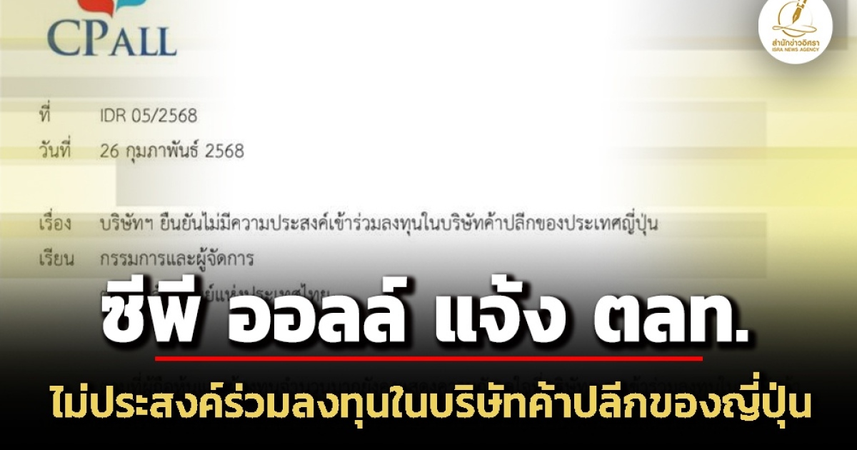 สำนักข่าวอิศรา (www.isranews.org) รายงานว่า วันที่ 26 กุมภาพันธ์ 2568 ซีพีออลล์ ทำหนังสือถึงกรรมการและผู้จัดการตลาดหลักทรัพย์แห่งประเทศไทย (ตลท.) เรื่อง บริษัทฯ ยืนยันไม่มีความประสงค์เข้าร่วมลงทุนในบริษัทค้าปลีกของประเทศญี่ปุ่น ลงนามโดย นายเกรียงชัย บุญโพธิ์อภิชาต ประธานเจ้าหน้าที่บริหารด้านการเงิน ผู้มีอำนาจรายงานสารสนเทศ โดยมีโดยความดังนี้
