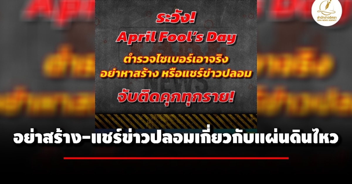 ตร.เตือน 1 เม.ย. วัน April Fools' Day อย่าสร้าง-แชร์ข่าวปลอมเกี่ยวกับแผ่นดินไหว ทำผิดมีโทษทั้งจำคุกไม่เกิน 5 ปี-ปรับไม่เกิน 1 แสนบาท
