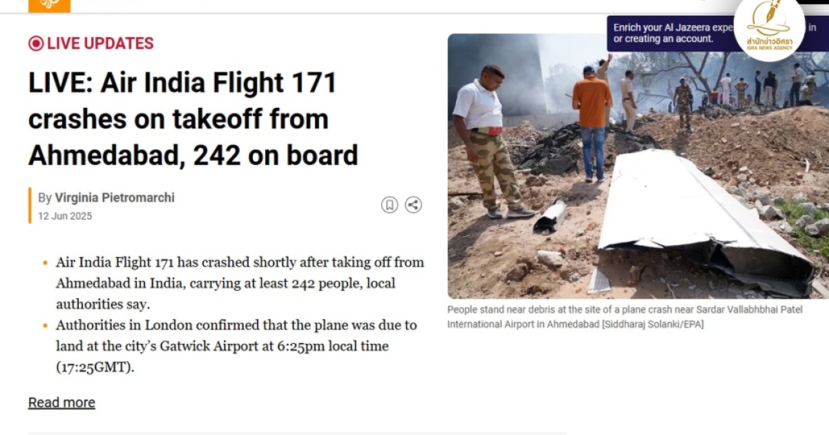 สำนักข่าวอิศรา (www.isranews.org) รายงานข่าวอ้างสำนักข่าวเอเอฟพีว่า เมื่อวันพฤหัสบดีที่ 12 มิถุนายน 2568 กล่าวว่า เกิดเหตุเครื่องบินโดยสารที่มุ่งหน้าสู่ลอนดอนตกในเมืองอัห์มดาบาด ทางตะวันตกของอินเดีย มีผู้โดยสาร 242 คนอยู่บนเครื่องซึ่งยังไม่ทราบชะตากรรมที่แน่ชัด