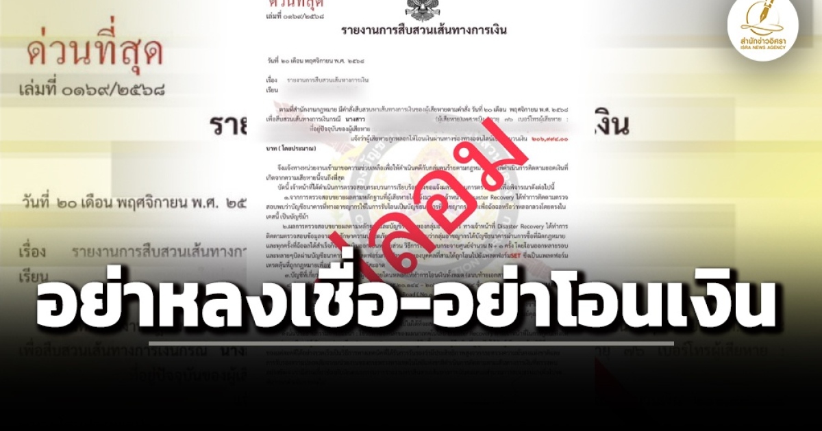 ศูนย์ต่อต้านการฉ้อโกงออนไลน์-ACSC เตือน ประชาชน ระวัง มิจฉาชีพ ซ้ำเติม ผู้เสียหาย ส่งเอกสารราชการปลอม รายงานสืบสวนเส้นทางการเงิน แอบอ้างเป็นเจ้าหน้าที่ลวงให้จ่ายค่าดำเนินการ แลกกับการติดตามเงินคืนผู้เสียหาย ย้ำ อย่าหลงเชื่อ อย่าโอนเงินเป็นอันขาด