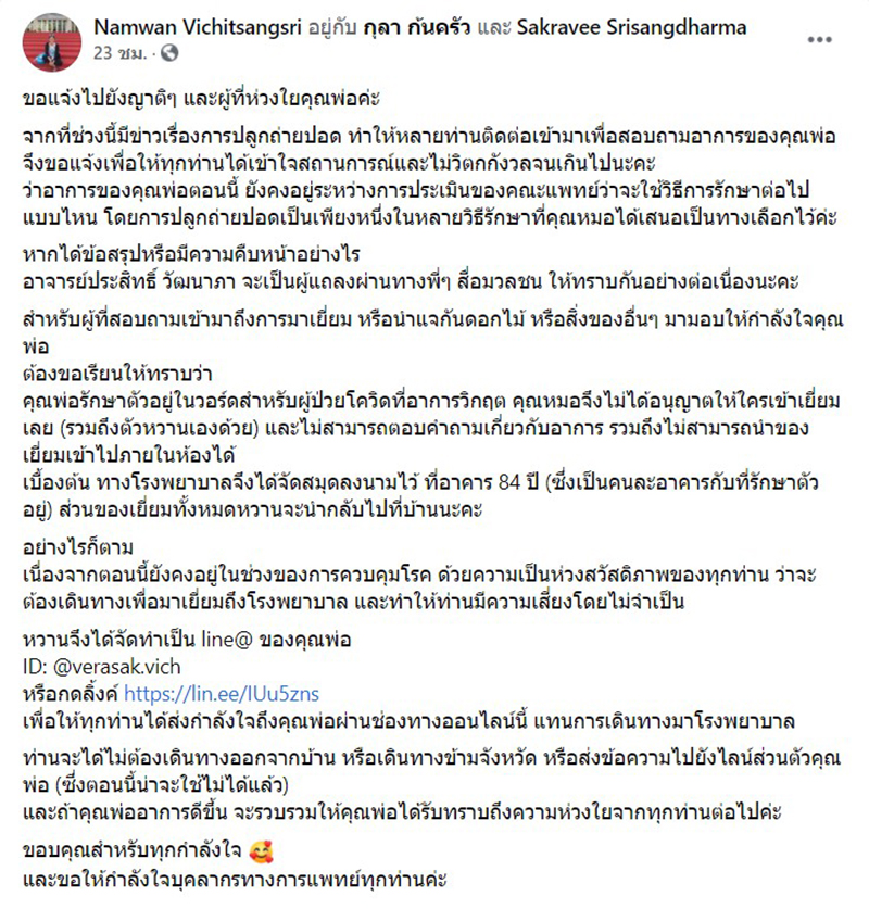 ส่วนแนวทางการรักษาของนายวีระศักดิ์ คณะแพทย์กำลังอยู่ระหว่างการประเมินว่าจะทำการรักษาด้วยวิธีการใด หนึ่งในนั้นคือการปลูกถ่ายปอด ซึ่งเป็นหนึ่งในหลายวิธีรักษาที่แพทย์เสนอไว้ หากมีข้อสรุปอย่างไร ศ.ดร.นพ.ประสิทธิ์ วัฒนาภา คณบดีคณะแพทยศาสตร์ศิริราชพยาบาล มหาวิทยาลัยมหิดล จะเป็นผู้แถลงผ่านสื่อต่อไป พร้อมทั้งได้จัดทำ Line : @verasak.vich เพื่อให้ทุกคนร่วมส่งกำลังใจ แทนการเดินทางมาโรงพยาบาลอีกด้วย