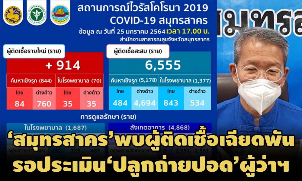 สำนักข่าวอิศรา (www.isranews.org) รายงานว่า เมื่อวันที่ 25 ม.ค. 2564 เวลา 17.00 น. ศูนย์รับข้อมูล COVID-19 จังหวัดสมุทรสาคร รายงานผลการค้นหาผู้ติดเชื้อว่าพบผู้ป่วยรายใหม่ 914 ราย เป็นการค้นหาเชิงรุก 844 รายแบ่งเป็นต่างด้าว 760 รายและคนไทย 84 ราย นอกจากนี้พบผู้ติดเชื้อในโรงพยาบาล 70 ราย แบ่งเป็นต่างด้าว 35 ราย คนไทย 35 ราย