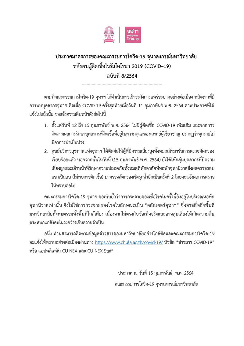 สำนักข่าวอิศรา (www.isranews.org) รายงานว่า เมื่อวันที่ 15 ก.พ. 64 คณะกรรมการโควิด-19 จุฬาลงกรณ์มหาวิทยาลัยประกาศมาตรการฉบับที่ 8/2564 แจ้งความคืบหน้าการตรวจคัดกรองเชิงรุกบริเวณหอพักจุฬานิวาสและพื้นที่ใกล้เคียงมหาวิทยาลัยทั้งหมด