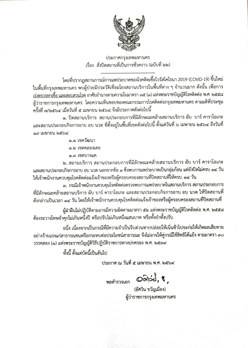 จึงมีมติปิดสถานบันเทิง จำนวน 196 แห่งที่อยู่ใน 3 เขต ได้แก่ เขตคลองเตย จำนวน 75 แห่ง เขตวัฒนา จำนวน 81 แห่ง และเขตบางแค จำนวน 40 แห่ง โดยให้ปิดเป็นระยะเวลาอย่างน้อย 14 วัน เริ่มตั้งแต่วันที่ 6 -19 เม.ย.2564 เพื่อทำการค้นหาผู้ติดเชื้อเชิงรุกอย่างเข้มข้น หลังจากนั้นจะประเมินสถานการณ์อีกครั้ง ส่วนสถานบันเทิงที่อยู่นอกพื้นที่ใน 3 เขตนี้ หากพบมีผู้ติดเชื้อจะพิจารณาปิดเป็นรายๆ