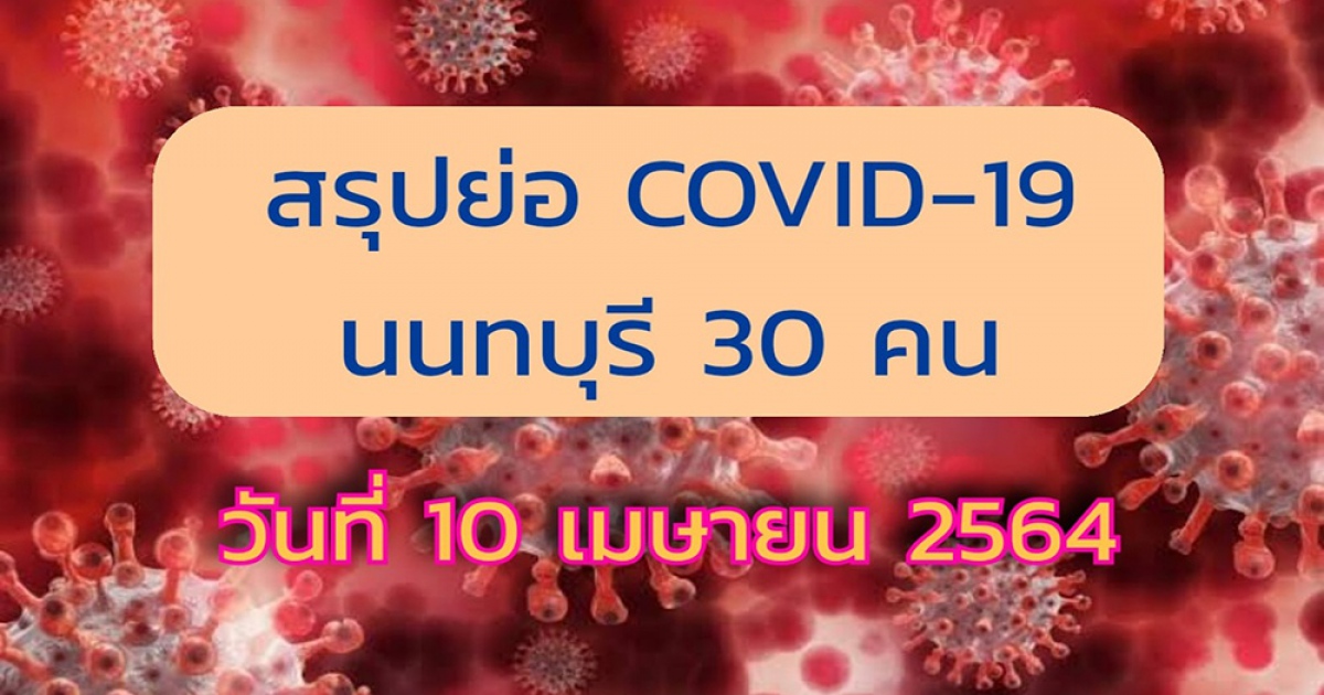 สำนักข่าวอิศรา (www.isranews.org) วันที่ 10 เม.ย. 2564 ศูนย์ปฏิบัติการ COVID-19 จังหวัดนนทบุรี โดยสำนักงานสาธารณสุขจังหวัดนนทบุรี รายงานผู้ป่วยยืนยัน โควิด-19 นนทบุรี จำนวน 30 ราย ส่วนใหญ่เกี่ยวข้องกับสถานบันเทิง เพศหญิง 12 ราย เพศชาย 18 ราย ภูมิลำเนา อ.เมือง 10 ราย อ.ปากเกร็ด 7 ราย อ.บางบัวทอง 5 ราย อ.บางใหญ่ 4 ราย อ.ไทรน้อย 3 ราย และ อ.บางกรวย 1 ราย ความสัมพันธ์ 1. สถานบันเทิง กทม 14 ราย 2. The Moon Bar 2 ราย3. สัมผัส ผู้ป่วยยืนยัน 9 ราย 4. ไม่ทราบแหล่งชัดเจน 5 ราย ดังนี้