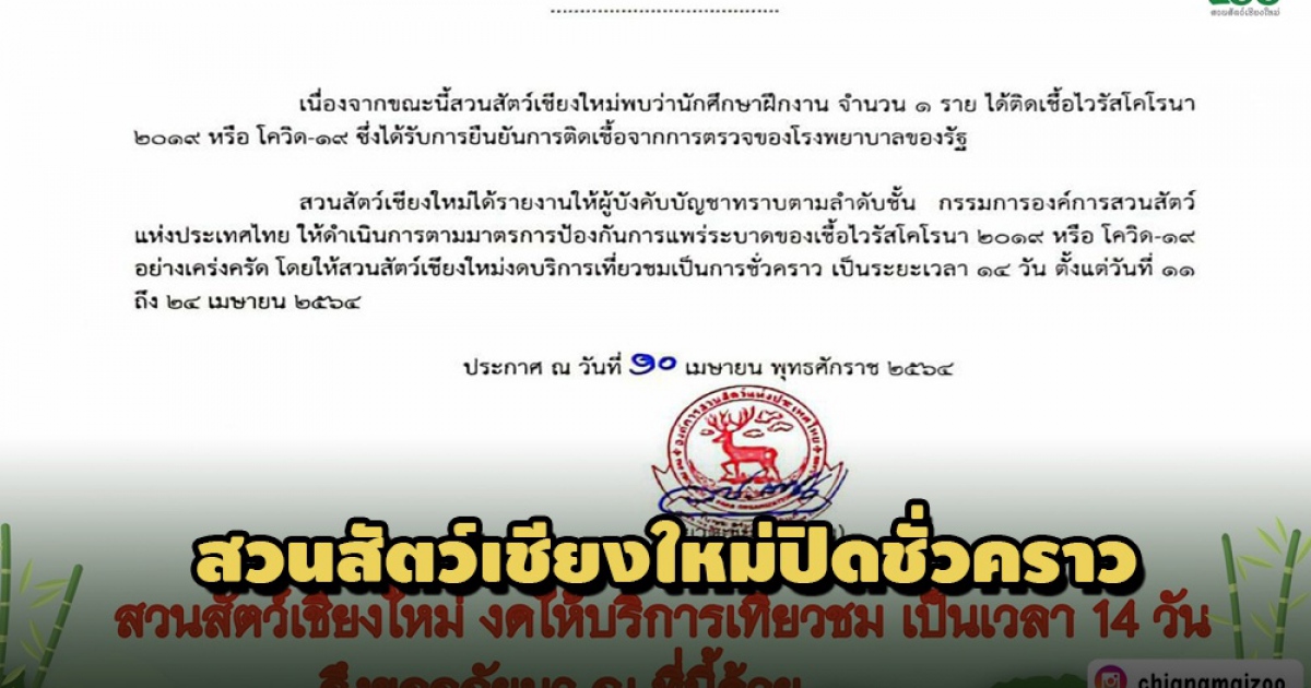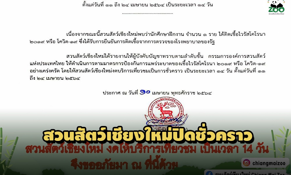 สวนสัตว์เชียงใหม่ปิดชั่วคราว 11-24 เม.ย. 64 เหตุพบ นศ.ฝึกงาน 1 ราย ติดโควิด-19 ให้ผู้เสี่ยงสูงกักตัว-ดำเนินการฉีดพ่นยาฆ่าเชื้อ ทำความสะอาดก่อนเปิดพื้นที่อีกครั้ง