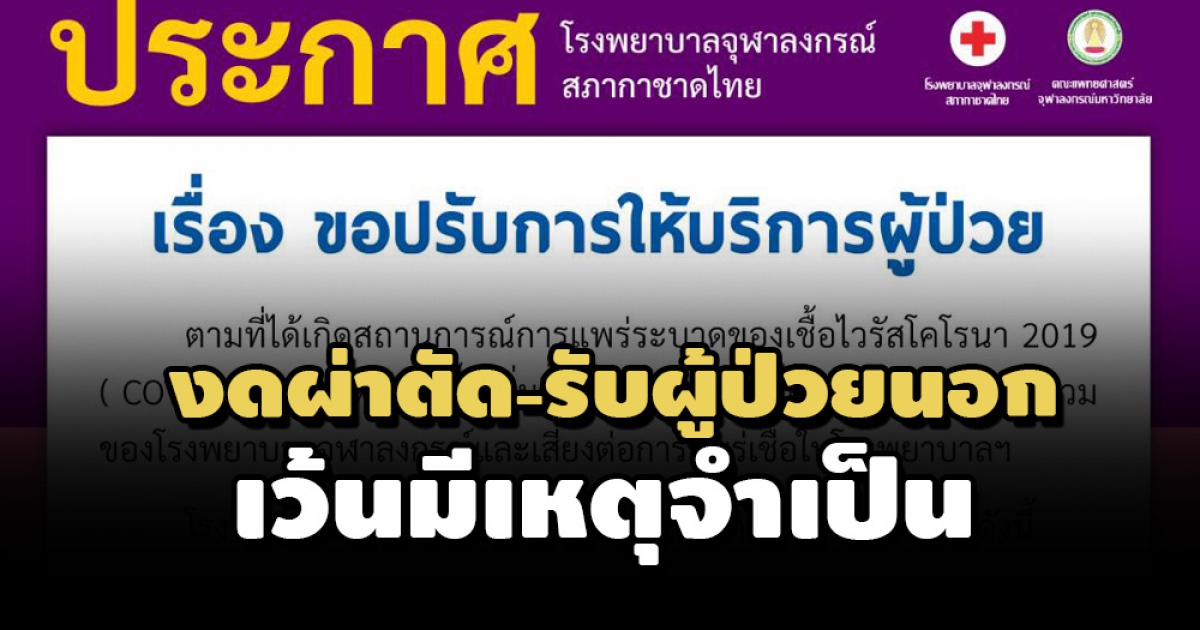 โรงพยาบาลจุฬาลงกรณ์ สภากาชาดไทย ประกาศปรับการให้บริการผู้ป่วย งดรับผู้ป่วยนอก งดผ่าตัด ยกเว้นมีเหตุจำเป็นเร่งด่วน โดยให้มีผลตั้งแต่วันที่ 16-30 เม.ย.