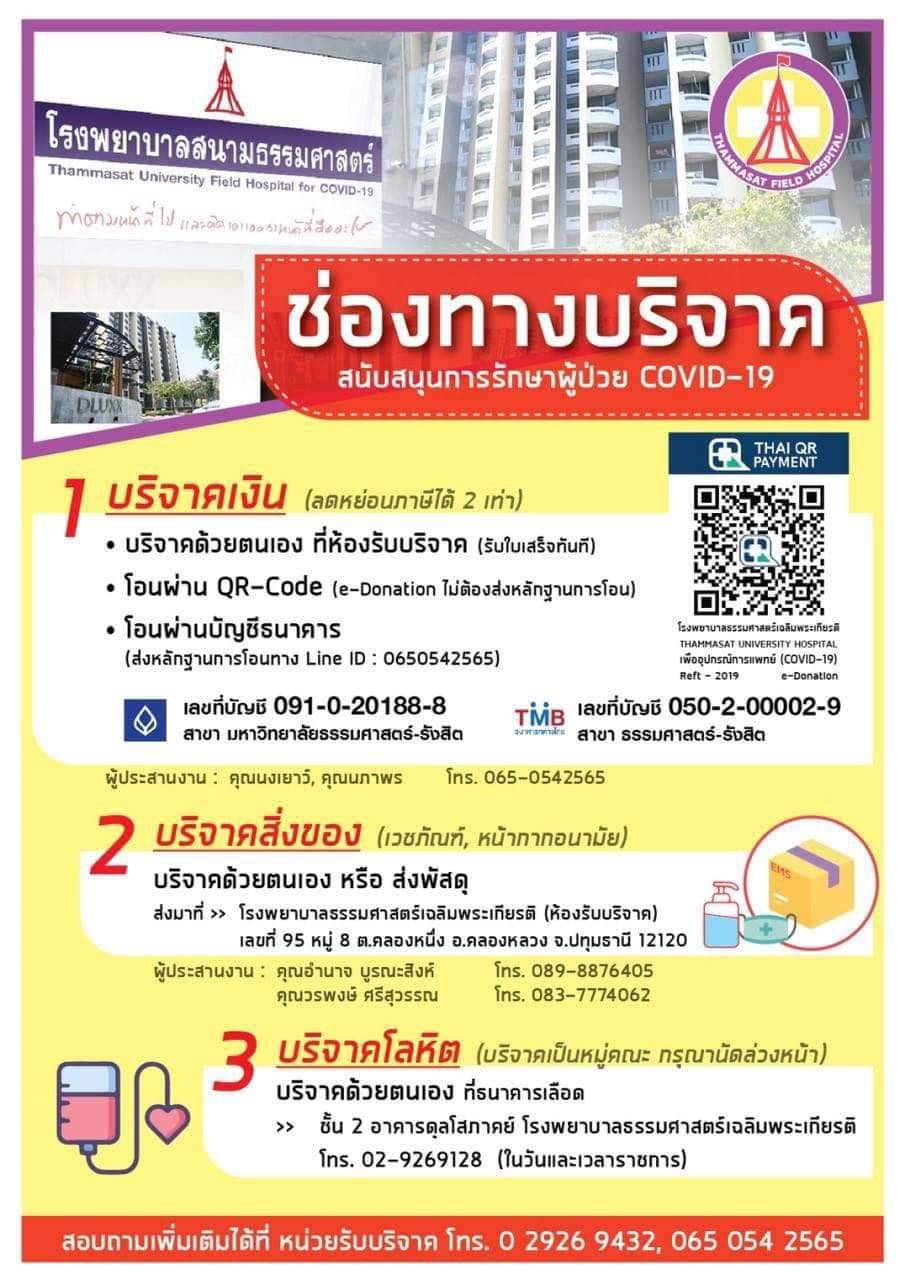 โรงพยาบาลธรรมศาสตร์เฉลิมพระเกียรติ ประกาศเปิดรับบริจาคเงินสมทบทุนจัดซื้ออุปกรณ์การแพทย์ ในอาคารโรงพยาบาลสนาม 308 เตียง เพื่อรองรับผู้ป่วยโควิด-19 ระลอก 3 โดยสามารถบริจาคได้ที่ บัญชี โรงพยาบาลธรรมศาสตร์เฉลิมพระเกียรติ หรือหากอยากนำสิ่งของจำเป็น เช่น หน้ากากอนามัย หรืออุปกรณ์การแพทย์มาบริจาคด้วยตัวเอง สามารถเดินทางมาได้ที่ ห้องรับบริจาคของโรงพยาบาลฯ โดยใบเสร็จสามารถใช้ลดหย่อนภาษีได้ 2 เท่า