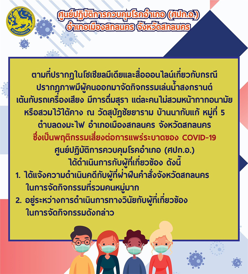 ล่าสุด ศูนย์ปฏิบัติการควบคุมโรคอำเภอ (ศปก.อ.) อ.เมืองสกลนคร จ.สกลนคร กล่าวถึงเหตุการณ์ที่ปรากฎในโซเชียลมีเดียดังกล่าวว่า การกระทำดังกล่าวเป็นพฤติกรรมเสี่ยงต่อการแพร่ระบาดของโควิด ซึ่ง ศปก.อ. ได้ดำเนินการกับผู้เกี่ยวข้องแล้ว โดยได้แจ้งความดำเนินคดีผู้ฝ่าฝืนคำสั่งจังหวัดสกลนคร ในการจัดกิจกรรมที่รวมคนหมู่มาก และอยู่ระหว่างการดำเนินการทางวินัยกับผู้ที่เกี่ยวข้องในการจัดกิจกรรมดัวกล่าว