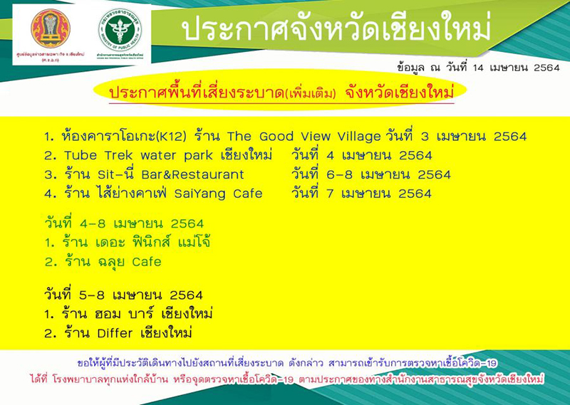 ทั้งนี้ เมื่อวันที่ 14 เม.ย.2564 เวลา 20.00 น. สำนักงานสาธารณสุขจังหวัดเชียงใหม่ ได้ออกประกาศพื้นที่เสี่ยงระบาด จังหวัดเชียงใหม่เพิ่มเติม โดยขอให้ผู้ที่มีประวัติเดินทางไปยังสถานที่เสี่ยงระบาดดังกล่าว สามารถเข้ารับการตรวจหาเชื้อโควิด ได้ที่ รพ. ใกล้บ้านทุกแห่ง หรือจุดตรวจหาเชื้อโควิดตามประกาศของจังหวัดเชียงใหม่