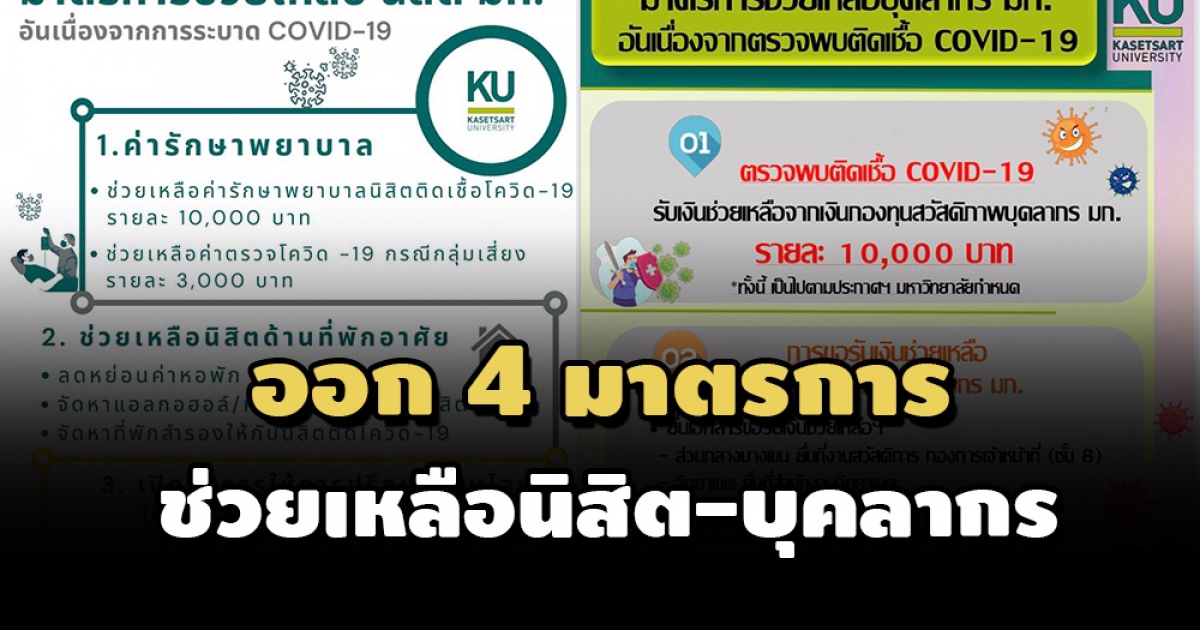 ม.เกษตรศาสตร์ ออกมาตรการช่วยจ่ายค่าตรวจโควิดแก่นิสิต 3,000 บาท - ค่ารักษา 10,000 บาท ส่วนบุคลากรให้รับเงินช่วยเหลือจากกองทุนสวัสดิภาพ มก.ได้ในอัตราเดียวกัน หลังพบผู้ติดเชื้อในมหาวิทยาลัยสะสมกว่า 40 ราย