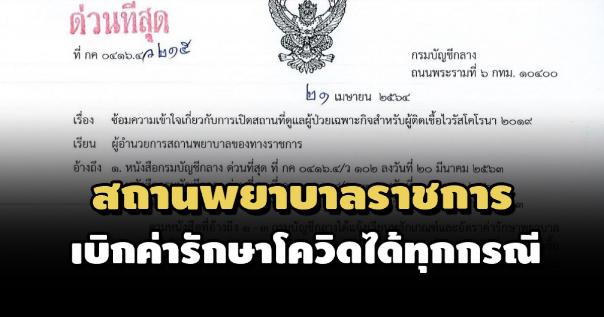 กรมบัญชีกลาง ส่งหนังสือถึงสถานพยาบาลของราชการ ยืนยันสามารถเบิกค่ารักษาโควิดตามสิทธิได้ทุกกรณี แม้ผู้ป่วยจะรักษาตัวในสถานที่เฉพาะกิจที่จัดตั้งขึ้นใหม่
