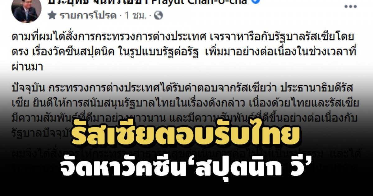 ผู้สื่อข่าวรายงานว่า เมื่อวันที่ 22 เม.ย.2564 พล.อ.ประยุทธ์ จันทร์โอชา นายกรัฐมนตรี และ รมว.กลาโหม โพสต์ข้อความผ่าน ประยุทธ์ จันทร์โอชา Prayut Chan-o-cha ระบุว่า ตามที่ได้สั่งการกระทรวงการต่างประเทศ เจรจาหารือกับรัฐบาลรัสเซียโดยตรง เรื่องวัคซีนสปุตนิก วี ในรูปแบบรัฐต่อรัฐ ปัจจุบันกระทรวงการต่างประเทศได้รับคำตอบจากรัสเซียว่า นายวลาดิเมียร์ ปูติน ประธานาธิบดีรัสเซีย ยินดีให้การสนับสนุนรัฐบาลไทยในเรื่องดังกล่าว เนื่องด้วยไทยและรัสเซียมีความสัมพันธ์ที่ดีมาอย่างยาวนาน และมีความสัมพันธ์ที่ดีขึ้นอย่างต่อเนื่องกับรัฐบาลปัจจุบัน และได้รับทราบว่ากระทรวงสาธารณสุขได้ดำเนินการ ตามสั่งการแล้วโดยได้นัดบริษัทตัวแทนสปุตนิก วี ในไทย มาหารืออย่างเร่งด่วน