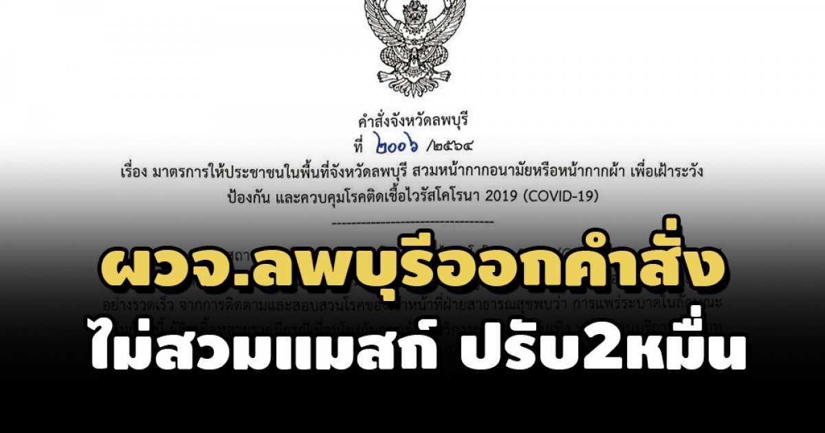 ผู้ว่าราชการจังหวัดลพบุรี ออกคำสั่งให้ประชาชนสวมหน้ากากอนามัย-หน้ากากผ้าตลอดเวลา เมื่ออยู่นอกบ้าน หากฝ่าฝืนมีโทษปรับไม่เกิน 20,000 บาท