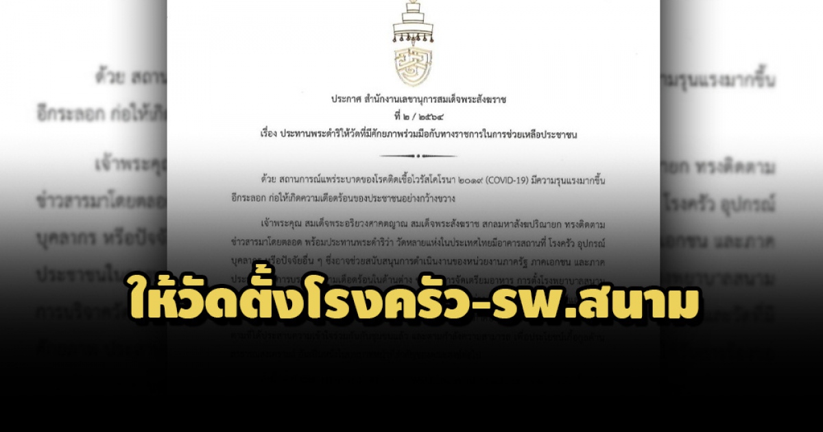 สมเด็จพระสังฆราช ประทานพระดำริให้วัดตั้งโรงครัว และ รพ.สนาม สนับสนุนการดำเนินงานของทุกภาคส่วนในการบรรเทาความเดือดร้อนให้กับประชาชนช่วงสถานการณ์โควิด