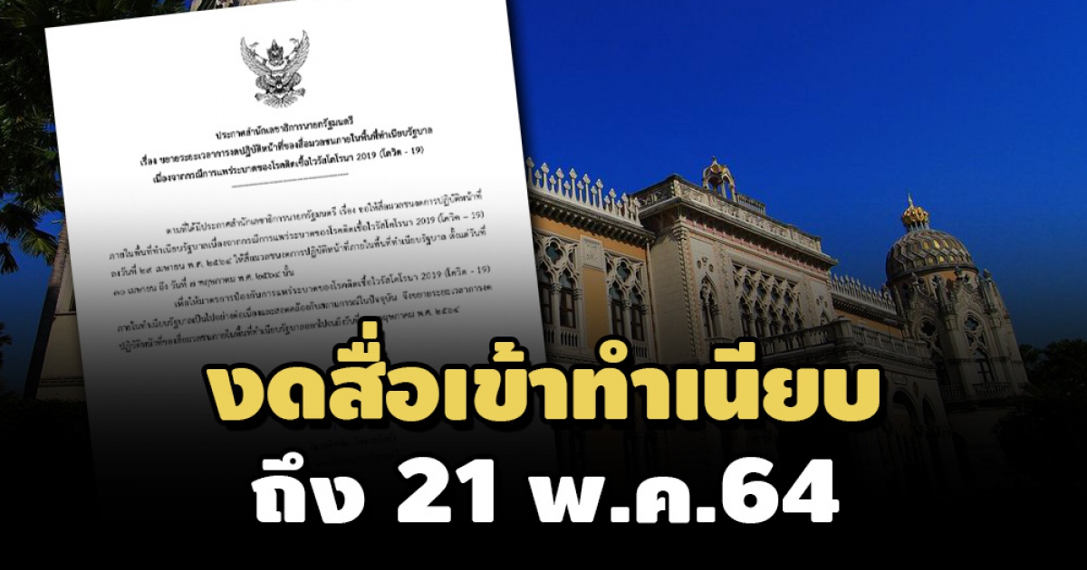 สำนักเลขาธิการนายกรัฐมนตรี ประกาศขยายเวลา งดสื่อเข้าทำเนียบรัฐบาลต่อถึง 21 พ.ค. เหตุจากสถานการณ์โควิด