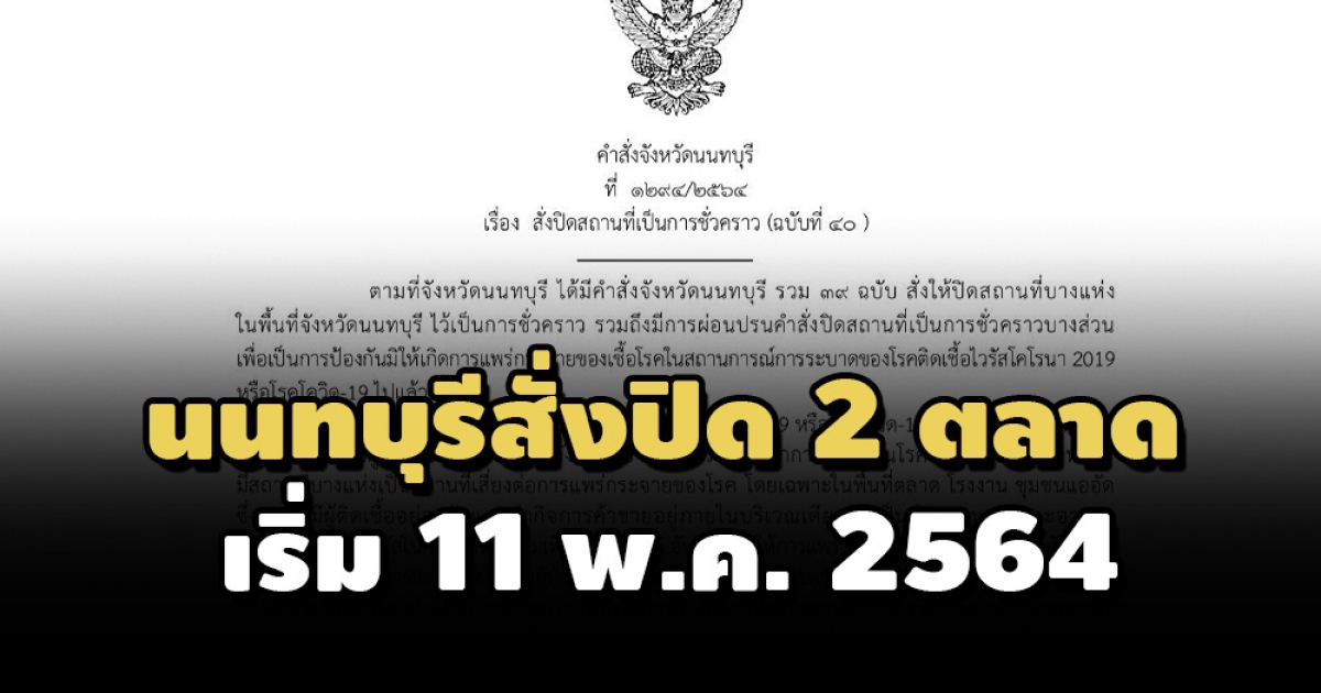นนทบุรี สั่งปิดตลาดสดเทศบาลนนทบุรี - ตลาดสดสมบัติ พร้อมอาคารพาณิชย์ สถานประกอบการ ร้านค้า รถเข็น หาบเร่ แผงลอยทุกประเภท ในพื้นที่โดยรอบ 14 วัน ส่วนพื้นที่ฝั่งตรงข้าม 7 วัน เริ่ม 11 พ.ค. 2564