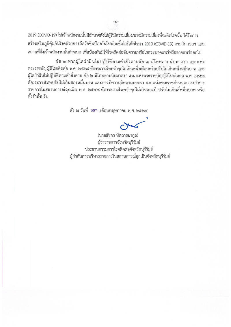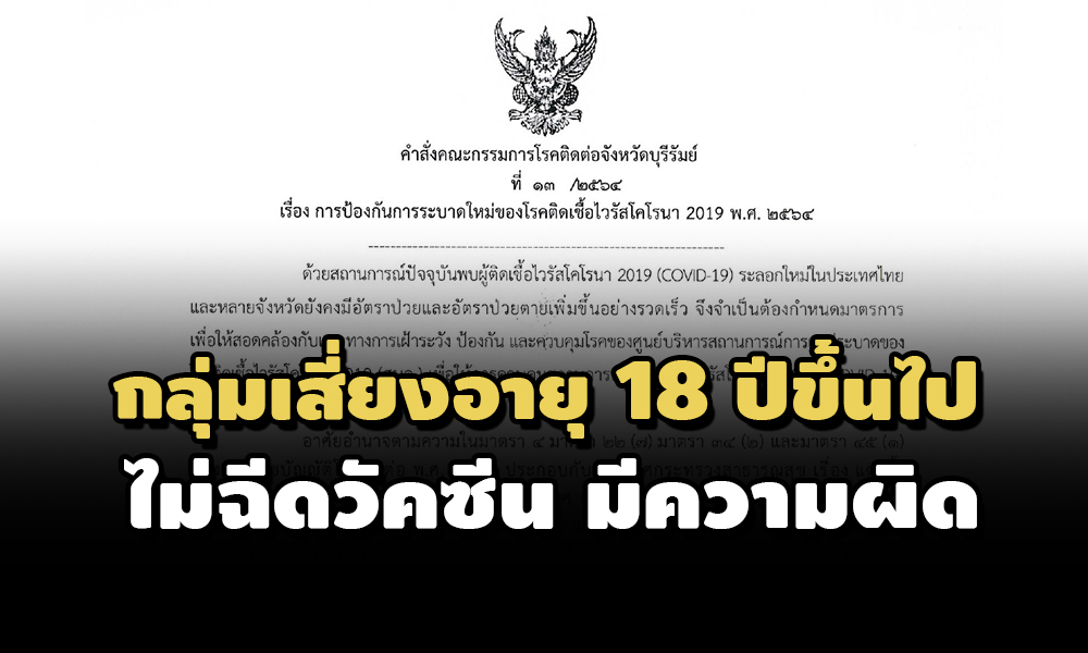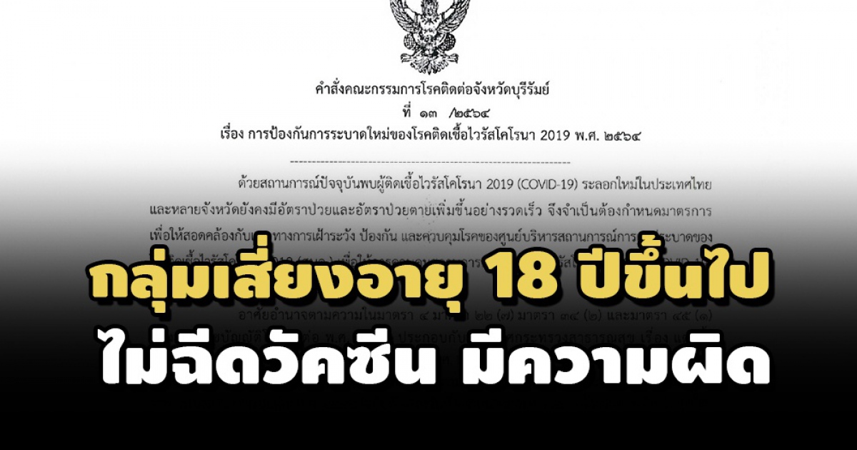 คณะกรรมการโรคติดต่อจังหวัดบุรีรัมย์ออกคำสั่ง ประชาชนกลุ่มเสี่ยงที่มีอายุ 18 ปีขึ้นไป ไม่ฉีดวัคซีน มีโทษตามมาตรา 51 พรบ.โรคติดต่อ พ.ศ. 2558 ปรับไม่เกิน 20,000 บาท และอาจมีความผิดตามมาตรา 18 พรก.ฉุกเฉิน พ.ศ. 2548 จำคุกไม่เกิน 2 ปี ปรับไม่เกิน 40,000 บาท หรือทั้งจำทั้งปรับ