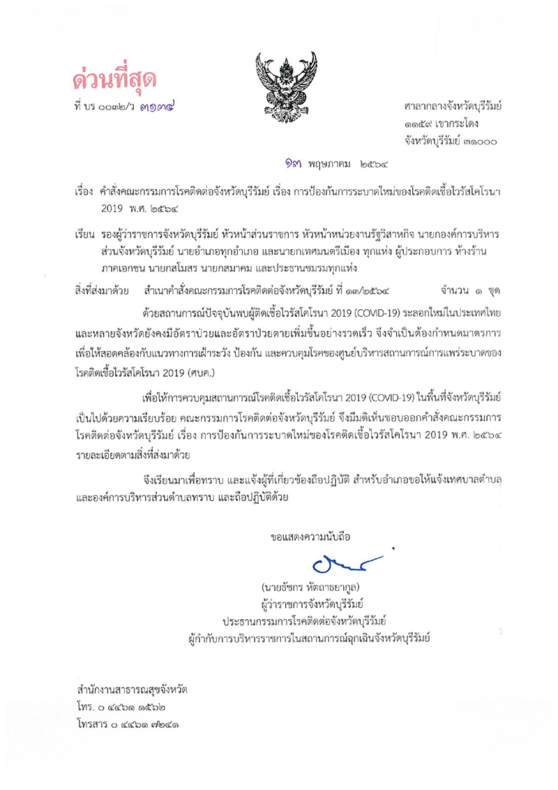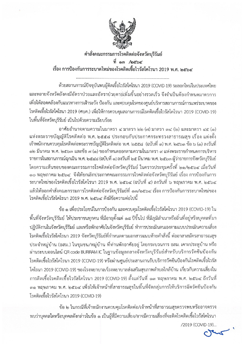สำนักข่าวอิศรา (www.isranews.org) รายงานว่า เมื่อวันที่ 14 พ.ค.2564 คณะกรรมการโรคติดต่อจังหวัดบุรีรัมย์ ออกคำสั่งคณะกรรมการโรคติดต่อจังหวัดบุรีรัมย์ ที่ 13/2564 เรื่องการป้องกันการระบาดใหม่ของโรคโควิด พ.ศ.2564 ระบุว่า ด้วยสถานการณ์ปัจจุบันยังพบผู้ติดเชื้อโควิดระลอกใหม่ในประเทศไทยและหลายจังหวัด ยังคงมีอัตราป่วยตายเพิ่มขึ้นอย่างรวดเร็ว จึงต้องกำหนดมาตรการ เพื่อให้สอดคล้องกับแนวทางการเฝ้าระวัง ป้องกัน และควบคุมโรคของศูนย์บริหารสถานการณ์การแพร่ระบาดของโควิด เพื่อให้การควบคุมสถานการณ์โรคโควิดในพื้นที่จังหวัดบุรีรัมย์ เป็นไปด้วยความเรียบร้อย ดังมีข้อความต่อไปนี้