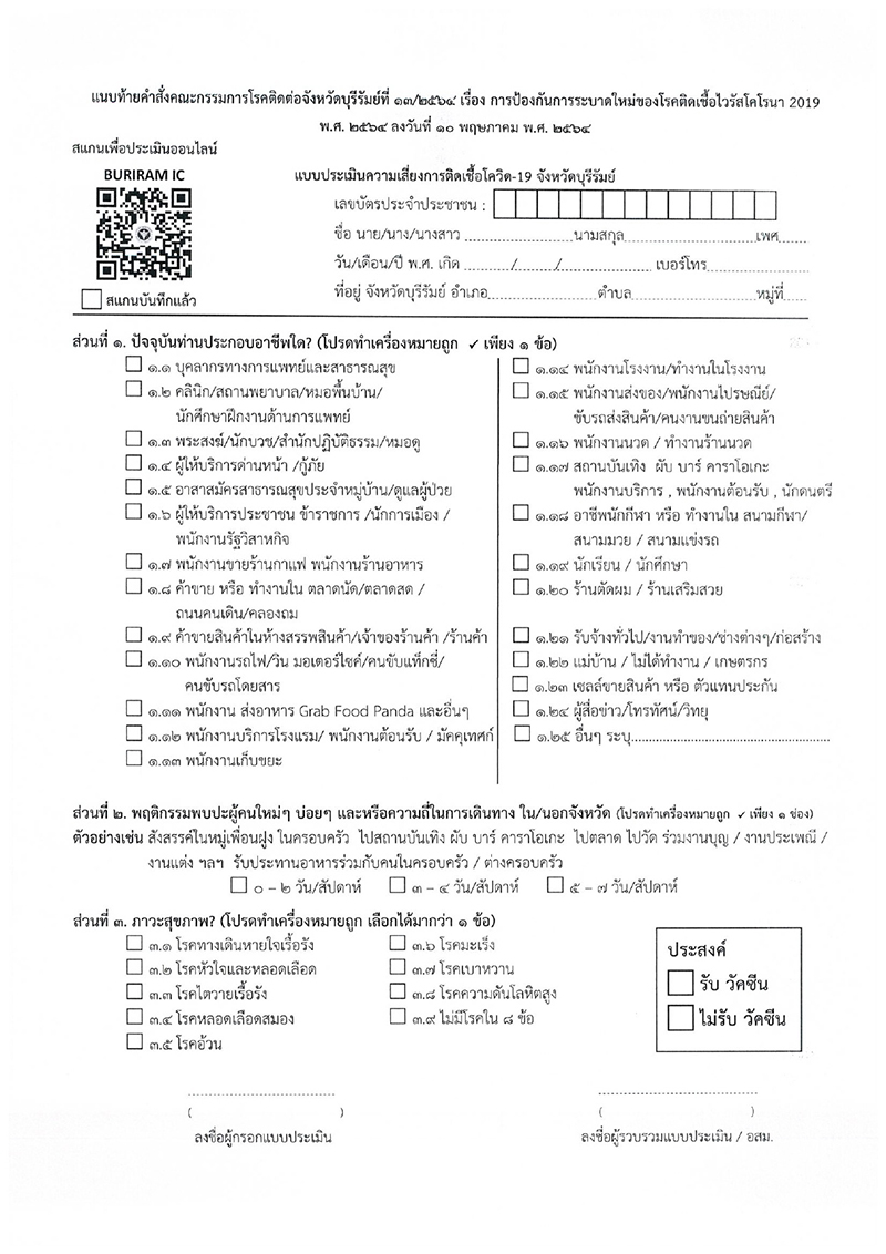 ข้อ 1 เพื่อประโยชน์ในการป้องกันและควบคุมโรคโควิด ในพื้นที่จังหวัดบุรีรัมย์ ให้ประชาชนทุกคน ที่มีอายุตั้งแต่ 18 ปีขึ้นไป ที่มีภูมิลำเนาหรือถิ่นที่อยู่ หรือบุคคลที่มาปฏิบัติงานในจังหวัดบุรีรัมย์ และหรือพักอาศัยในจังหวัดบุรีรัมย์ ทำการประเมินตนเองตามแบบประเมินความเสี่ยงโรคโควิดจังหวัดบุรีรัมย์ ที่กำหนดตามเอกสารแนบท้ายคำสั่งนี้ ต่ออาสาสมัครสาธารณสุขประจำหมู่บ้าน (อสม.)ในชุมชนหรือหมู่บ้าน ที่ท่านพักอาศัยอยู่