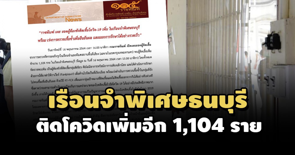 กรมราชทัณฑ์เผยพบผู้ต้องขัง เรือนจำพิเศษธนบุรี ติดเชื้อโควิดพบเพิ่มอีก 1,104 ราย พร้อมเร่งการตรวจเชื้อซ้ำเพื่อยืนยันผล เพื่อแยกการรักษาได้อย่างรวดเร็ว