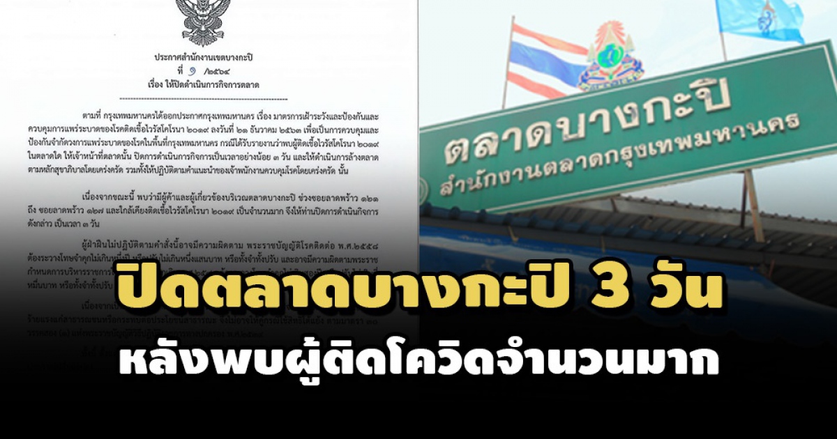 เนื่องจากขณะนี้ พบว่ามีผู้ค้าและผู้เกี่ยวข้องบริเวณตลาดบางกะปี ช่วงซอยลาดพร้าว 121 ถึง ซอยลาดพร้าว 129 และใกล้เคียง ติดเชื้อเป็นจำนวนมาก จึงให้ปิดการดำเนินกิจการดังกล่าว เป็นเวลา 3 วัน
