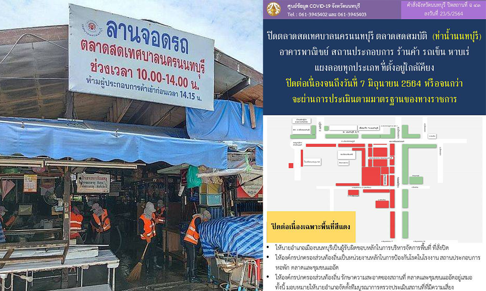 นายสุจินต์ ไชยชุมศักดิ์ ผู้ว่าราชการจังหวัดนนทบุรี มีคำสั่งให้ปิดตลาดทั้ง 2 แห่ง อาคารพาณิชย์ หาบเร่ แผงลอย และปิดอะพาร์ตเมนต์ดังกล่าวเป็นเวลา 14 วัน ตั้งแต่วันที่ 14-24 พ.ค. 64
