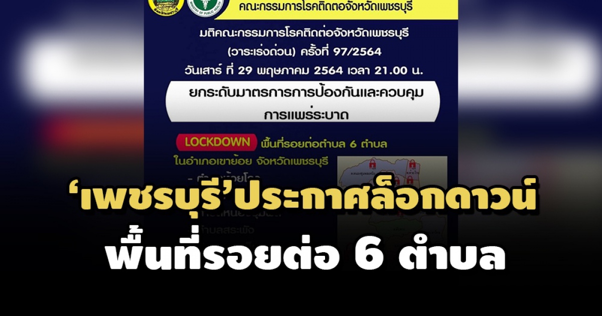 คณะกรรมการโรคติดต่อจังหวัดเพชรบุรี ออกประกาศยกระดับมาตรการคุมโควิด ล็อกดาวน์พื้นที่รอยต่อ 6 ตำบล ในอำเภอเขาย้อย 14 วัน เริ่มวันที่ 31 พ.ค.2564