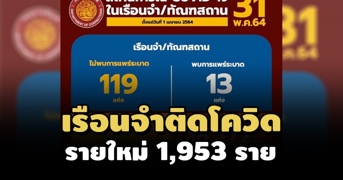 ผู้สื่อข่าวรายงานว่า เมื่อวันที่ 31 พ.ค. 2564 ศบค.กรมราชทัณฑ์ เผยสถานการณ์การแพร่ระบาดของโรคติดเชื้อไวรัสโควิดในเรือนจำและทัณฑสถาน ข้อมูล ณ วันที่ 30 พ.ค. 2564 เวลา 18.00 น. มีผู้ต้องขังติดเชื้อรายใหม่ จำนวน 1,953 ราย รักษาหาย 1,315 ราย ทำให้มีผู้ต้องขังที่ยังติดเชื้ออยู่ในการดูแลของกรมราชทัณฑ์ 16,272 ราย