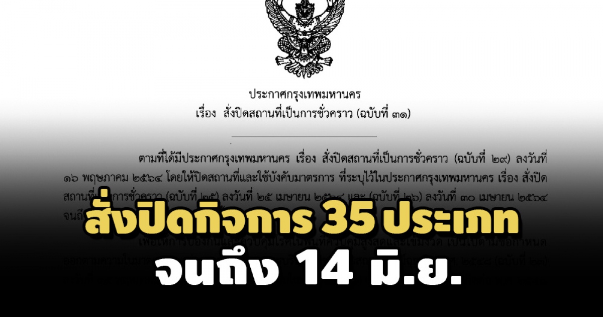 กทม.ประกาศสั่งปิดสถานที่ 35 ประเภทต่อไปจนถึง 14 มิ.ย. เพื่อป้องกันการระบาดของเชื้อโควิดในพื้นที่