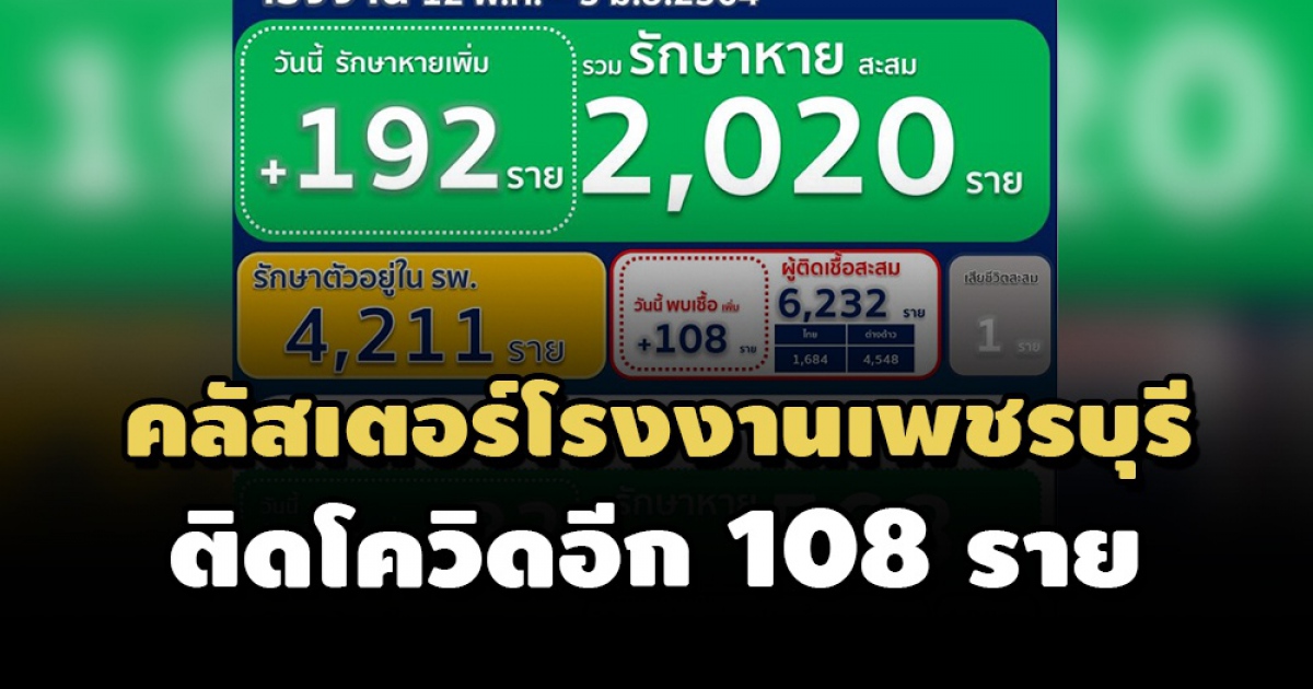 จังหวัดเพชรบุรี ติดโควิดอีก 130 ราย เป็นคลัสเตอร์โรงงาน 108 ราย รวมผู้ติดเชื้อจากการระบาดระลอกใหม่ 7,069 ราย เสียชีวิตสะสม 8 ราย ปรับเวลาฉีดวัคซีนผู้จองคิวหมอพร้อม วันที่ 8-30 มิ.ย.64 ส่วนผู้ที่จองคิวในวันที่ 7 มิ.ย.64 มาฉีดได้ตามกำหนดเดิม