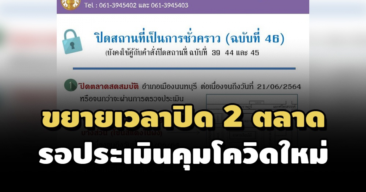 ผู้สื่อข่าวรายงานว่า เมื่อวันที่ 6 มิ.ย.2564 ศูนย์ข้อมูล COVID-19 นนทบุรี เปิดเผยคำสั่งจังหวัดนนทบุรี ที่ 1558/2564 เรื่อง สั่งปิดสถานที่เป็นการชั่วคราว (ฉบับที่ 46) ระบุว่า กรมอนามัย กระทรวงสาธารณสุขได้ร่วมกับจังหวัดนนทบุรีและเทศบาลนครนนทบุรีเป็นคณะตรวจประเมินความพร้อมในการเปิดให้บริการตลาดสดเทศบาลนครนนทบุรี และตลาดสดสมบัติ อำเภอเมืองนนทบุรี